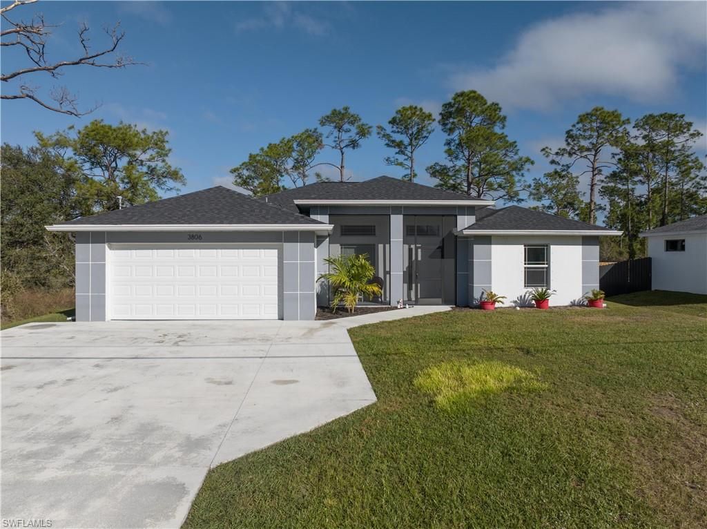 Enjoy peaceful, easy living in this thoughtfully designed 4-bedroom, 3-bathroom home with a den, pool, and an in-law suite. The private in-law suite includes its own entry, a bedroom, full bathroom, kitchenette with a pantry, and is perfect for multigenerational living or guests. The modern kitchen features quartzite countertops, a subway tile backsplash, a spacious island, and soft-close engineered wood cabinets. The master bathroom offers a spa-like retreat with a freestanding soaking tub and frameless glass shower. Tile flooring runs throughout, and the home is equipped with top-of-the-line water conditioning equipment. Conveniently located near SR 82 with quick access to Fort Myers and I-75, this home combines a quiet neighborhood setting with easy access to city conveniences. With pride of ownership evident in every detail, this is the perfect place to call home.